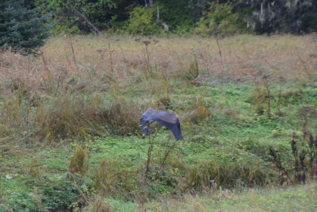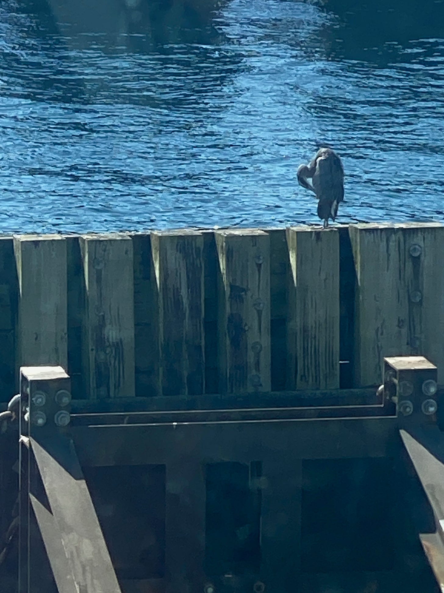 “The sisters crossed the bridge, their heads turning to look all around them. They could see little through the mist. However, cloud-cloaked trees peeked out here and there, and they realized that to their right, indeed loomed a mountain of blue, green, and grey. The mist lifted a little and where the sun shone through, the sisters walked until they found they had reached the shore. They followed the tideline for a long time, snapping photos along the way. They wondered if they would ever get to see the photos, lost as they were, but it was a familiar pastime and so they continued. Eventually they found their own footsteps in the sand and realized they must be on an island. As the clouds shifted, lifting up off of the water, they saw a Heron sitting on the remnants of a dock.
